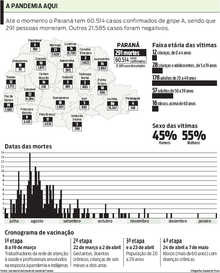 O Paraná deverá vacinar 3,3 milhões de pessoas contra a gripe A. O primeiro lote de vacinas deve chegar ao estado em duas semanas. A vacinação, como no restante do país, será feita em quatro etapas e atenderá a grupos prioritários definidos a partir da análise da situação epidemiológica brasileira e de critérios estabelecidos pela Organização Mundial de Saúde. A campanha terá duração de aproximadamente dois meses, tendo início no dia 8 de março e conclusão prevista para 7 de maio.