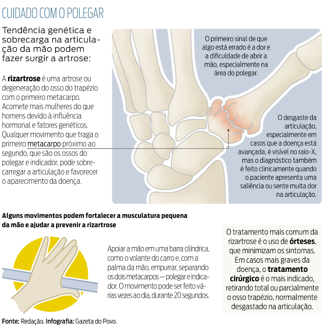Cada 1kg segurado pelos dedos indicador e polegar representa 10kg que essa "pinça" formada pela mão precisa aguentar. A transmissão da força que vem desde o metacarpo (área entre o punho e os dedos), com o passar do tempo, faz com que a articulação do polegar próximo ao punho se degenere mais rapidamente, gerando a rizartrose. Mais comum entre idosos, ela atinge principalmente e de modo mais grave as mulheres, devido a fatores hormonais.