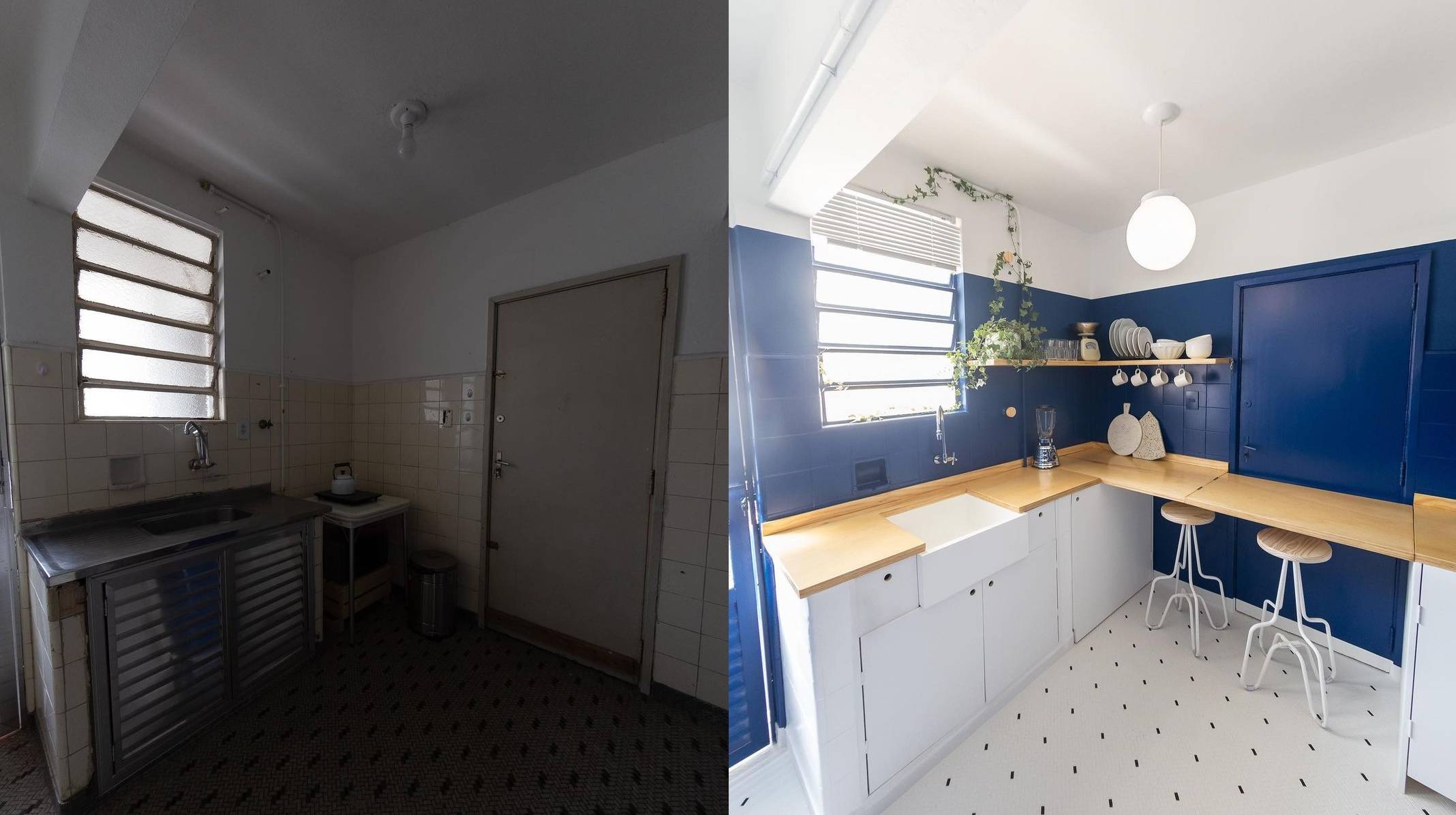 Faça Você MesmoAntes e depois: cozinha abandonada ganha decor azul, com bancada retrátil e cuba de fazenda