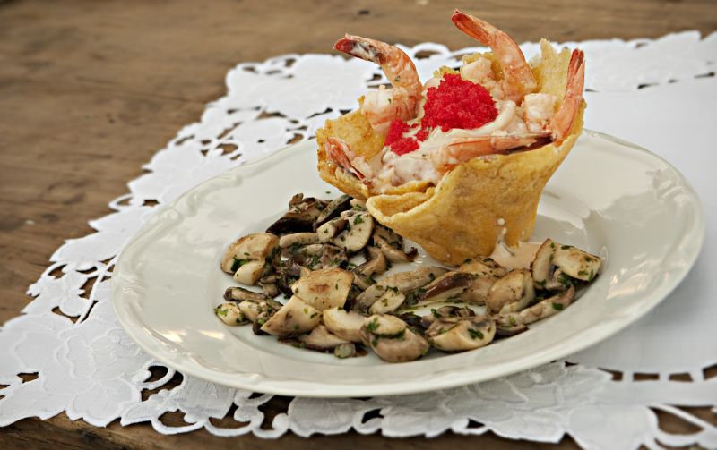 Camarões e pinhões flambados com cachaça de Morretes