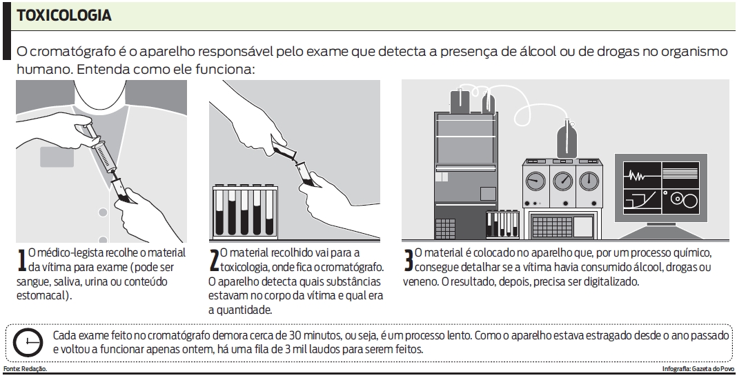 O principal motivo do atraso nos laudos do IML foi a quebra do cromatógrafo, aparelho que faz exames de toxicologia e que estava inoperante desde o ano passado. Ontem, ele voltou a funcionar após ser consertado em São Paulo. Apesar disso, o IML informa que a fila vai continuar porque a demanda de serviços é grande. O aparelho faz um exame a cada 30 minutos. Além disso, após o exame ficar pronto, os laudos precisam ser digitalizados. Como hoje existem apenas dois digitadores, segundo o IML, o número é insuficiente.