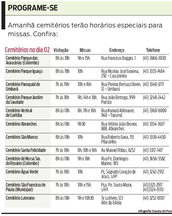Em diversos cemitérios, serão celebradas missas especiais de finados, cada uma sob a responsabilidade da paróquia do município. Hoje, às 19h30, no cemitério Nossa Senhora do Rosário, em Colombo, acontece a missa e Celebração da Luz, seguida de procissão com velas dentro do cemitério. No mesmo cemitério, amanhã, além das missas, que acontecem às 9 horas e às 16 horas, haverá recitação do terço, às 11 horas e às 15 horas. No cemitério Água Verde haverá adoração e missa a partir das 9h30, celebradas pelo padre Reginaldo Manzotti.