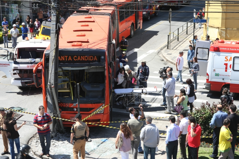 Onze pessoas ficaram feridas nenhuma em estado grave em um acidente que envolveu um caminhão guincho e um ônibus biarticulado, que estava com cerca de 200 passageiros a bordo, na esquina da Avenida Visconde de Guarapuava e Travessa da Lapa, ontem pela manhã, em Curitiba. "Quem mais se machucou estava na parte da frente do ônibus e em pé. Uma senhora de idade e uma gestante, que estavam de pé, se feriram", conta a passageira Denise Barão, que estava com a filha de 13 anos as duas saíram ilesas porque ficaram nos bancos do fundo, mas permaneceram no local por cerca de uma hora. A menina ficou em estado de choque. A gestante Andressa Vicente de Paula, 21 anos, grávida de quase nove meses, foi levada ao hospital com alteração na pressão arterial e ficou em observação até o início da tarde. Segundo o marido dela, Fábio Antônio Gonçalves, de 18 anos, Andressa estava sentada improvisadamente no guarda-roda do veículo no momento do acidente. "Ela disse que o ônibus estava lotado e não havia onde sentar. Ninguém ofereceu lugar". Apesar do susto, a mãe e o bebê passam bem e já voltaram para casa.