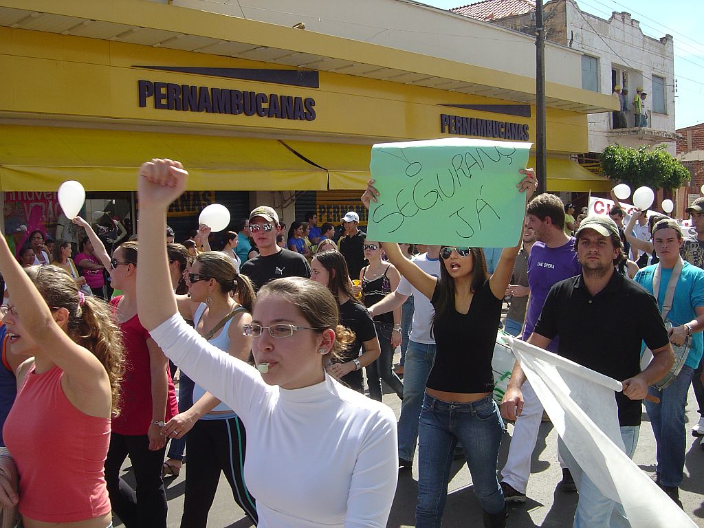 Bandeirantes - Cerca de 2 mil estudantes saíram ontem à tarde às ruas de Bandeirantes, Norte Pioneiro, para protestar contra a onda de violência e a precariedade no atendimento policial. De acordo com a polícia, somente neste ano foram registrados quatro estupros e vários assaltos. As vítimas são, na maioria, estudantes dos sete cursos de graduação das duas faculdades instaladas na cidade. Com pouco mais de 32 mil habitantes, Bandeirantes tem 5 mil universitários.