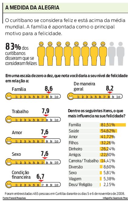 A felicidade, cantada em verso e prosa, tornou-se objeto de estudo da ciência com a psicologia positiva. O tema surgiu na década de 1980 quando um grupo de psicólogos decidiu estudar o lado positivo da mente humana. Descobriram que, apesar das adversidades, as pessoas se consideram felizes na maior parte do tempo. Pesquisa encomendada pela Gazeta do Povo ao Instituto Paraná Pesquisas mostra que 83% dos curitibanos se consideram felizes, porcentagem alta se comparada ao índice mundial. De acordo com o World Data Base of Happiness, estudo mundial sobre a felicidade, a campeã é a Dinamarca com a mesma média dos curitibanos: 8,2.