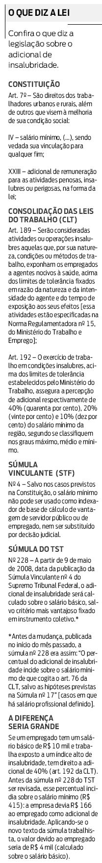 Estaria tudo certo, não fosse o fato de a súmula vinculante do STF informar que, uma vez utilizado como base de cálculo, o salário mínimo "não pode ser substituído por decisão judicial". Ou seja, o TST não poderia ter definido a nova base de cálculo. "O TST legislou e ele não tem poder legiferante", explica Roberto André Oresten, professor de Direito do Trabalho da Pontifícia Universidade Católica do Paraná. Nas palavras do ministro Gilmar Mendes, "a nova redação estabelecida para a súmula nº 228 do TST revela aplicação indevida da súmula vinculante nº 4, porquanto permite a substituição do salário mínimo pelo salário básico no cálculo do adicional de insalubridade sem base normativa".