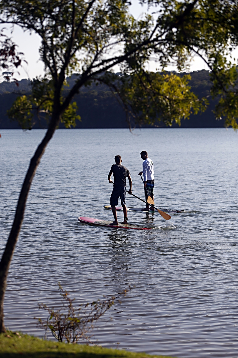 Foi em uma viagem a Jericoacoara, há quatro anos, que o empresário Adriano Ratzke, 37 anos, teve o primeiro contato com o stand up paddle. Gostou tanto que fez disso um negócio. "Entrei para dar força para um amigo e hoje trabalhamos como representantes da Califórnia Republic, uma das marcas que o Ibrahim comercializa. Estou sempre remando, na praia ou aqui [no Passaúna]. Exercita o corpo inteiro e desestressa. Lá dentro é um silêncio total", afirma.