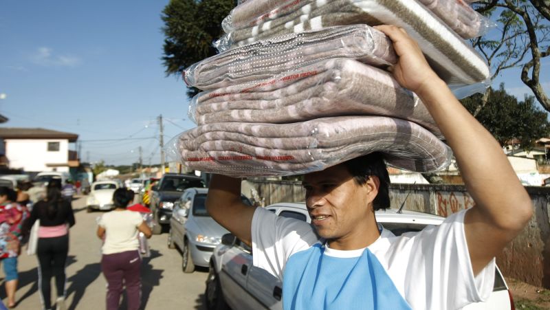 Com seis pacotes de cobertores na cabeça, Marcelo Ramos, 34 anos, sabe que naquela noite o frio será menor. Com uma das filhas pela mão tem três e mais oito enteados conta que "sem essa ajuda, seria muito mais difícil". A senha para conseguir as doações da Fundação de Ação Social da prefeitura foram conseguidas por intermédio da Associação Vida Nova, com sede na ocupação Ulisses Guimarães, no Pinheirinho.