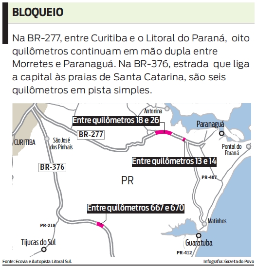 Na BR-376, ligação da capital com as praias de Santa Catarina, o tráfego continua em pista simples no sentido Joinvile (SC), do quilômetro 667 ao 670, entre Tijucas do Sul e Garuva (SC). No sentido Curitiba, o tráfego é feito por duas faixas entre os quilômetros 672 e 669, por causa de quedas de barreira, segundo a Autopista Litoral Sul, concessionária que administra a estrada. Não há previsão para término das obras.