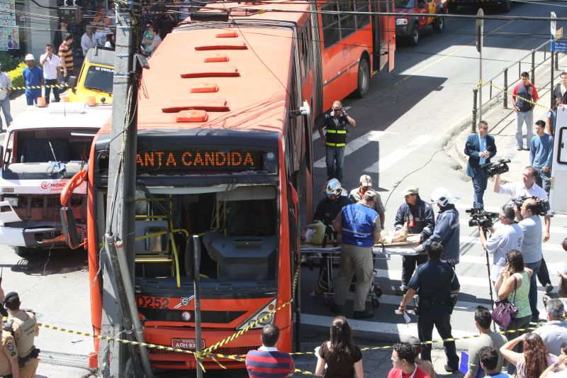 Uma colisão entre um ônibus biarticulado da linha Santa Cândida/Capão Raso e um caminhão-guincho deixou 11 feridos e o trânsito ficou caótico na região central de Curitiba por seis horas. O acidente ocorreu na esquina da Travessa da Lapa com a Avenida Visconde de Guarapuava, por volta das 11 horas desta quinta-feira (21), e o tráfego foi afetado até as 17h20.