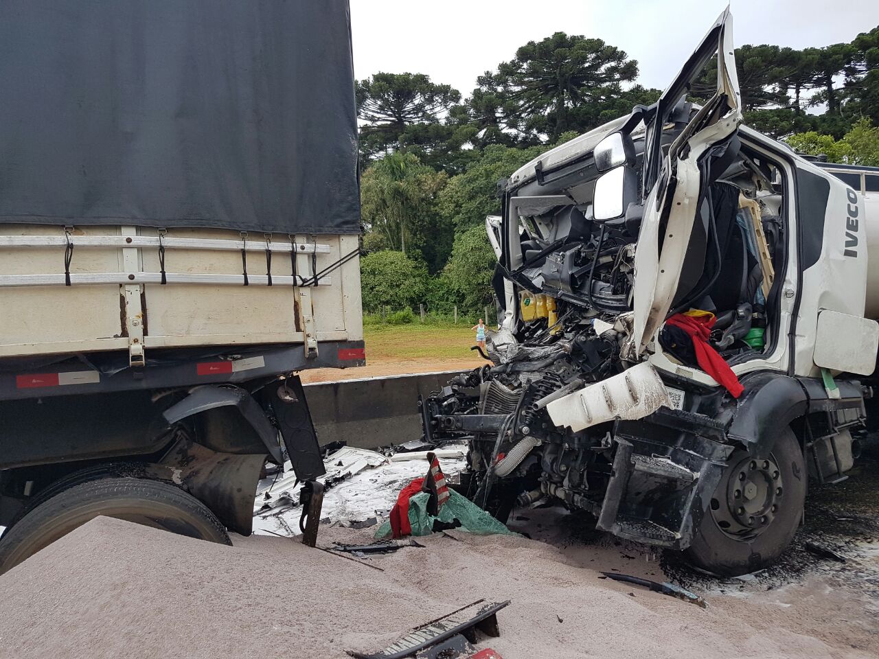 Dois caminhões colidiram na BR 116, no KM 106, em São José dos Pinhais, na região metropolitana de Curitiba, na tarde desta quarta-feira (28). O acidente aconteceu entre os viadutos da Avenida Rui Barbosa e da BR 376 por volta das 15h30. Um dos motoristas morreu no local.
