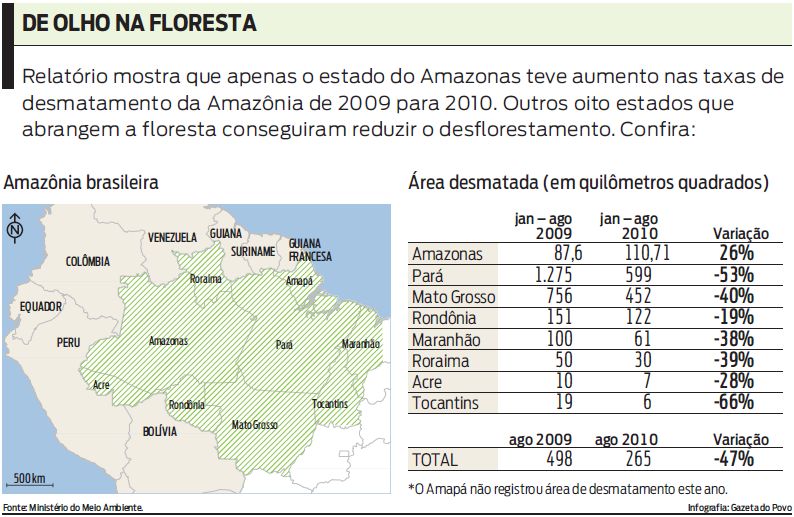 Na média geral dos estados, se analisado apenas o mês de agosto, houve uma queda no desmatamento de 47%: eram 498 km2 em agosto de 2009 e nesse ano foram 265 km2 no mesmo mês.