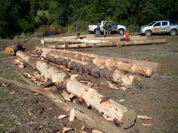 Dezoito toras de araúcária (Araucaria angustifolia) foram apreendidas no município de Jacuizinho, na região central do Rio Grande do Sul, nesta quarta-feira (27). A espécie consta da lista de espécies ameaçadas do Ibama e seu corte somente é autorizado em circunstâncias especiais.O volume de madeira apreendido pelos agentes do órgão ambiental federal totaliza 25 metros cúbicos e estava numa área utilizada para cultivo de fumo e milho, numa região de Mata Atlântica. O responsável foi multado em R$ 12,5 mil.