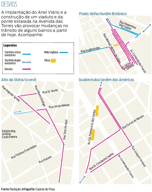 As ruas Sete de Abril, Alberto Bolliger, Augusto Severo, Doutor Goulin e Simão Bolívar, nos bairros Alto da Glória e Juvevê, em Curitiba, terão mudanças de sentido a partir de hoje (veja mapa). As alterações começam às 9 horas e fazem parte da implantação do Anel Viário. A Sete de Abril terá sentido único, da XV de Novembro a Itupava. O mesmo acontece com a Alberto Bolliger, entre a Itupava e a Simão Bolívar; e a Doutor Goulin, da Rua Barão de Guaraúna a Alberto Bolliger. A Simão Bolívar terá duas mudanças: sentido único da Alberto Bolliger até a Augusto Severo e mão inglesa entre a Mauá e a Augusto Severo. Esta última terá mão úníca entre a Paraguassu e a Doutor Goulin. Já o trânsito na Avenida das Torres também vai sofrer alterações a partir de hoje por causa da construção de uma trincheira no cruzamento com a Rua Guabirotuba e de um viaduto estaiado na altura da Avenida Coronel Francisco H. dos Santos.