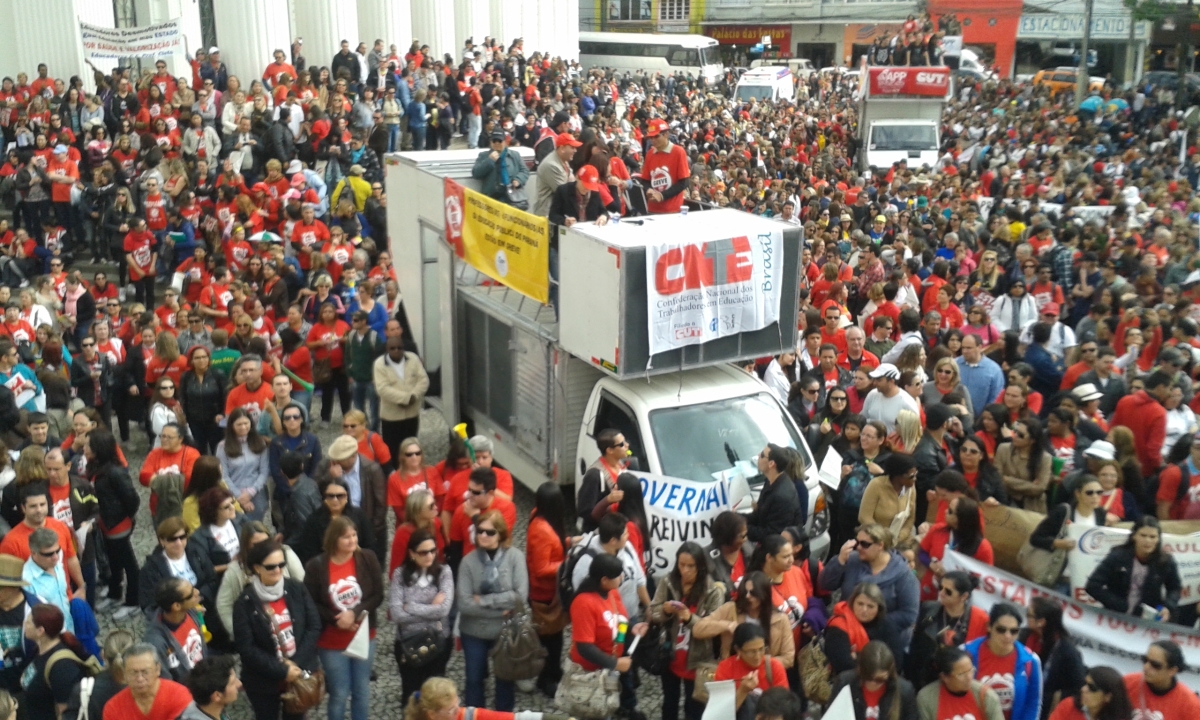 Em greve desde a última quarta-feira (23), professores da rede estadual de ensino no Paraná realizam um ato em frente ao Palácio Iguaçu desde a manhã desta terça-feira (29). A mobilização consiste em realização de discursos de autoridades vinculadas à categoria, e ocorre após a Marcha da Educação, iniciada pelos professores às 10 horas na Praça Santos Andrade, no Centro de Curitiba.