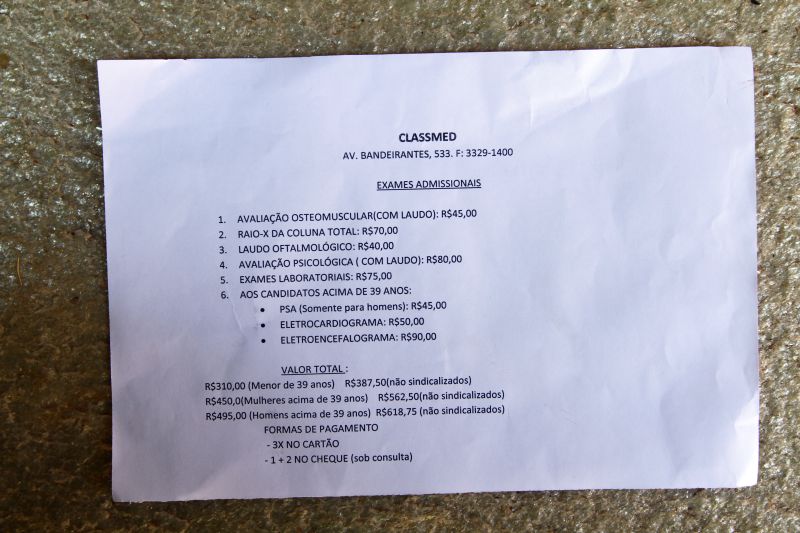 Ela contou ter recebido na Vila da Saúde um documento com o encaminhamento para os exames admissionais e também um papel que indica o endereço de uma clínica particular e lista os preços de cada exame. A candidata foi informada pelos funcionários da Secretaria Municipal de Saúde de que poderia realizar o exame em qualquer clínica. Mas recebeu o aviso de que o laboratório indicado apresentava os preços mais baixos.