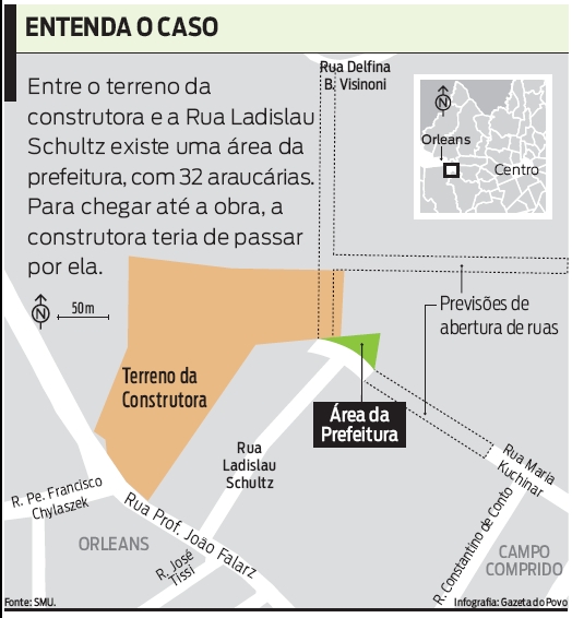 Entre o terreno da obra do condomínio Garden Odessa, da construtora Vanguard Home, e a Rua Ladislau Schultz, no bairro Orleans, há uma área de 1,2 mil metros quadrados, com 32 araucárias, pertencente à prefeitura de Curitiba. Na semana passada, a construtora ganhou uma liminar contra a administração municipal para derrubar um portão instalado pelos moradores da rua como medida de segurança.A Vanguard alega que o portão impede a passagem de caminhões até os fundos do terreno do condomínio, o que estaria atrasando a obra. Na terça-feira, a Secretaria Municipal de Urbanismo (SMU) foi até a rua para cumprir a liminar, mas foi impedida pela Polícia Militar, acionada pelos moradores, por falta de um documento.