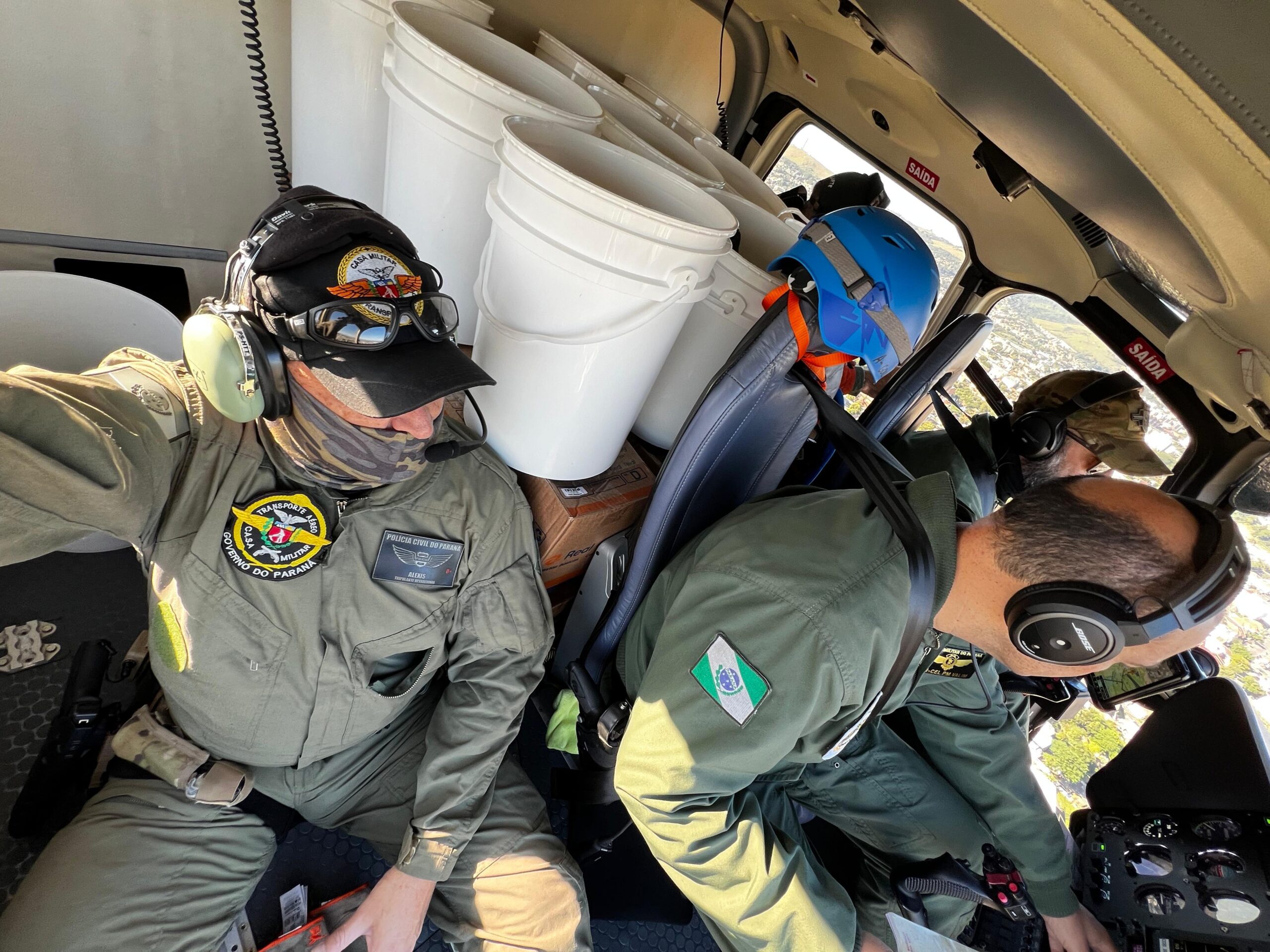 Na ação, ele relata que a Casa Militar do Paraná disponibilizou três aviões e um helicóptero para realizar 97 voos (foto abaixo), transportando 129 pessoas e centenas de alimentos e medicamentos para hospitais gaúchos.