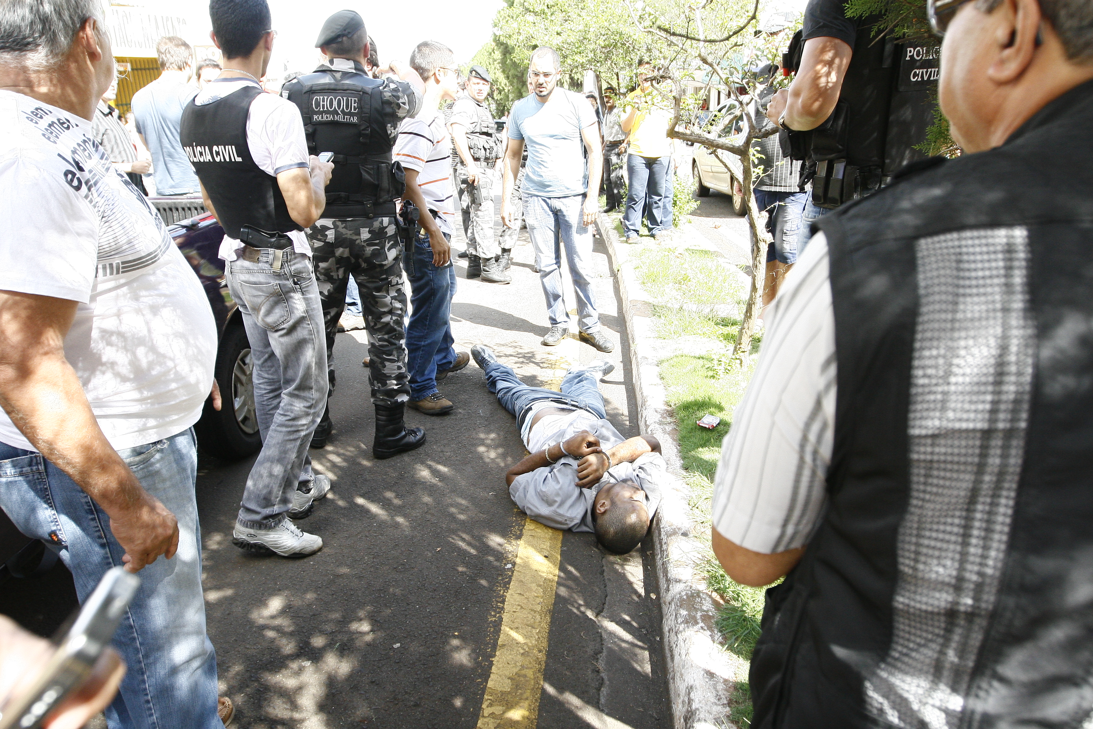 Três assaltantes tentaram levar uma mochila de dinheiro de um homem que estava perto de uma agência do Bradesco. Houve troca de tiros
