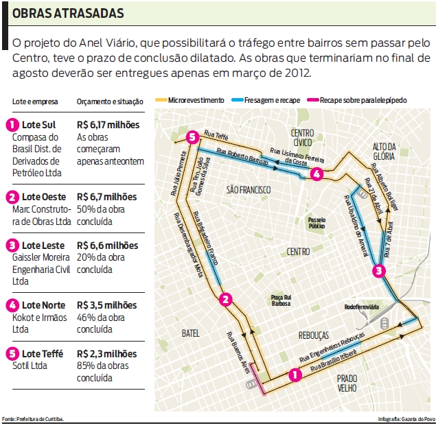 O Anel Viário, que possibilitará o tráfego entre bairros sem passar pelo centro de Curitiba, não vai ficar pronto na data prometida pela prefeitura da capital. A data-limite, que era no fim deste mês, mudou para março de 2012. Dos cinco lotes formadores do Anel três estão atrasados. As obras do lote sul, localizado entre os bairros Rebouças e Prado Velho, foram iniciadas apenas na última segunda-feira.