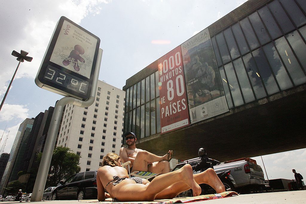 SÃO PAULO - A onda de calor também atinge o estado de São Paulo, onde a capital registrou ontem a terceira madrugada mais quente do ano. Um grupo de cerca de 20 pessoas surpreendeu quem passou ontem pela Avenida Paulista. Vestidos com roupas de banho, eles levaram esteiras e cadeiras de praia e tomaram sol em diferentes pontos da avenida.