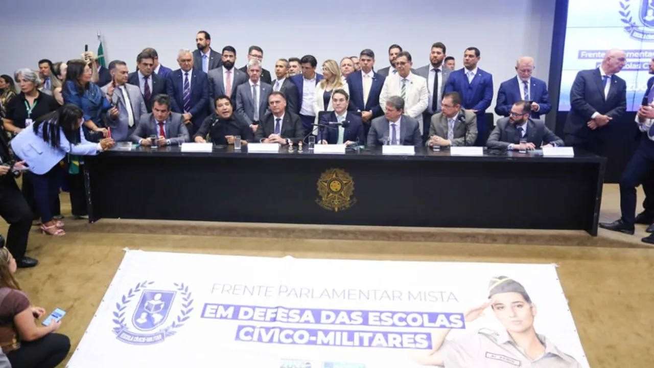 O ex-presidente da República, Jair Bolsonaro (PL), e o governador de São Paulo, Tarcísio Freitas (Republicanos), participaram do lançamento da Frente Parlamentar Mista em defesa das Escolas Cívico-Militares na Câmara dos Deputados na tarde desta quarta-feira (6). A Frente será presidida pelo deputado Luciano Zucco (Republicanos-RS); o vice-presidente será o senador Jorge Seif (PL-MG).