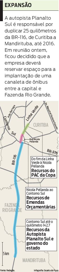 A Planalto Sul deve começar as intervenções no segundo semestre, deixando em aberto, caso não possam ser iniciadas, as obras da canaleta exclusiva de ônibus, bancadas pelo governo estadual. Além de melhorar o fluxo de veículos, a obra possibilitará desativar semáforo na altura da Vila Pompeia, no bairro Tatuquara, que gera congestionamentos intensos no horário de pico. O planejamento foi anunciado em reunião ontem, com representantes das prefeituras, da concessionária e da esfera federal. A duplicação da via está em fase de projeto e depende da liberação de Licença Prévia do Instituto Brasileiro do Meio Ambiente e dos Recursos Naturais (Ibama).