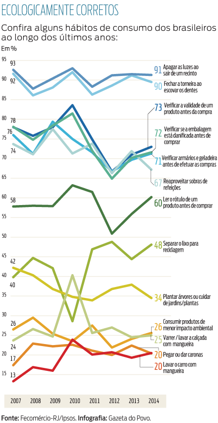 As campanhas de conscientização sobre problemas ambientais não têm surtido efeito no Brasil. Nos últimos oito anos, segundo pesquisa da Fecomércio RJ/Ipsos realizada em 70 cidades do país os porcentuais de economia de água, consumo de energia e alimentação saudável continuaram praticamente estáveis. Alguns, inclusive, chegaram a subir. Em 2007, por exemplo, apenas 13% da população lavava o carro com mangueira. Em 2014, o índice subiu para 20%.