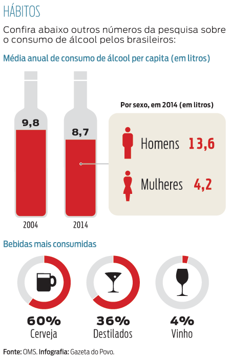 Baseada na avaliação de 194 países, a Organização Mundial da Saúde (OMS) definiu o consumo médio de álcool para pessoas acima de 15 anos em 6,2 litros por ano. No Brasil, os dados indicam um consumo médio de 8,7 litros por pessoa ao ano.