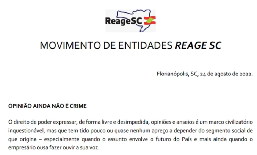 “Querer amordaçá-los, impedi-los de influir no debate político ou até mesmo de externar opiniões é um perigosíssimo aceno a regimes em que o delito de pensamento é um ato que pode acarretar a perda da própria vida”, afirmaram no manifesto. Ainda, o Movimento de Entidades Reage SC disse em nota que as associações, que assinaram o texto, representam milhões de brasileiros e destacaram que opinião não é crime.