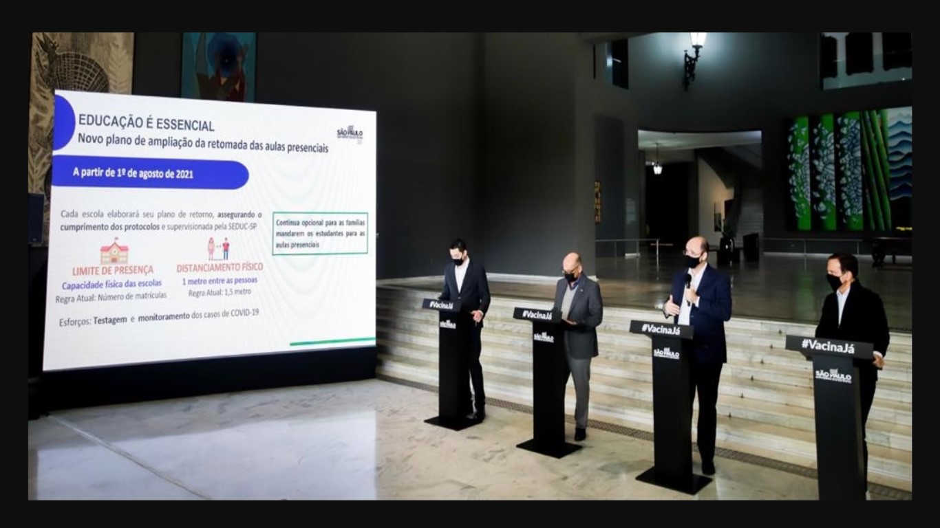 O governo de São Paulo anunciou nesta quarta-feira (16) o novo plano de ampliação das aulas presenciais nas escolas de educação básica do estado. As novas regras estabelecem que o cálculo da porcentagem de alunos permitidos será feito a partir da capacidade total de acolhimento das escolas e não mais pelo total de matrículas. O distanciamento mínimo entre os estudantes também será diminuído de 1,5 metro para 1 metro. As normas passam a valer a partir de agosto, quando se inicia o segundo semestre letivo.