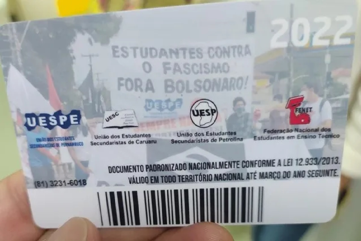 A União dos Estudantes Secundaristas de Pernambuco (UESPE) escolheu uma foto de uma manifestação contra o presidente Jair Bolsonaro (PL) para ilustrar o verso da carteirinha estudantil emitida pela entidade. Na imagem, é possível observar claramente estudantes segurando uma faixa com a frase “Estudantes contra o fascismo fora Bolsonaro”. A faixa ainda traz o logotipo da UESP e outras entidades estudantis, como a União dos Estudantes Secundaristas de Caruaru (UESC), União dos Estudantes Secundaristas de Petrolina (UESP) e Federação Nacional dos Estudantes em Ensino Tecnológico (FENET).