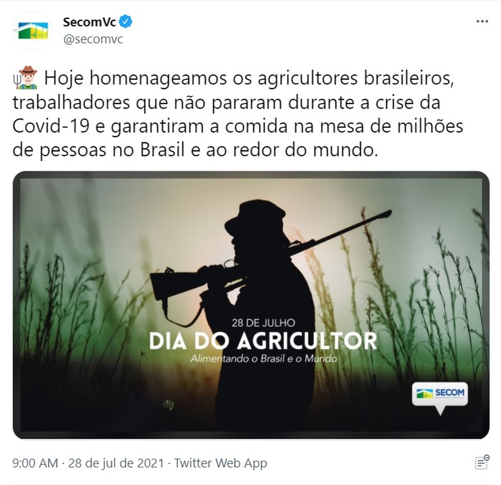A Secretaria de Comunicação do governo federal apagou um post nas redes sociais em que fazia uma homenagem ao Dia do Agricultor com uma imagem de um homem com uma espingarda no ombro. “Hoje homenageamos os agricultores brasileiros, trabalhadores que não pararam durante a crise da Covid-19 e garantiram a comida na mesa de milhões de pessoas no Brasil e ao redor do mundo”, dizia a mensagem. A exclusão ocorreu depois de a publicação ficar um pouco mais cinco horas no ar e receber inúmeras críticas.