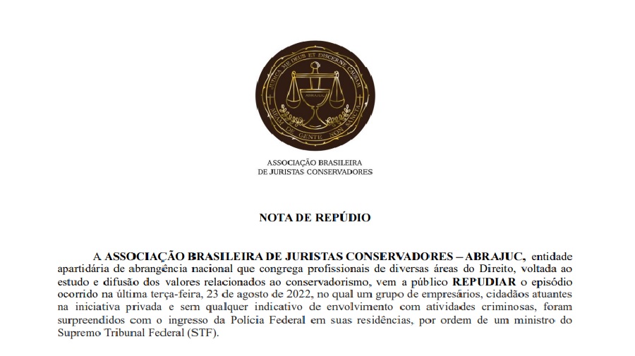 A Associação Brasileira de Juristas Conservadores (Abrajuc) divulgou nesta sexta-feira (26/8) uma nota de repúdio às "medidas judiciais sem fundamentação legal" proferidas pelo ministro Alexandre de Moraes, do Supremo Tribunal Federal, contra empresários, na última terça-feira (23/8). "Esse é mais um ato autoritário e sem amparo legal proveniente da Corte mais alta do país", escrevem.