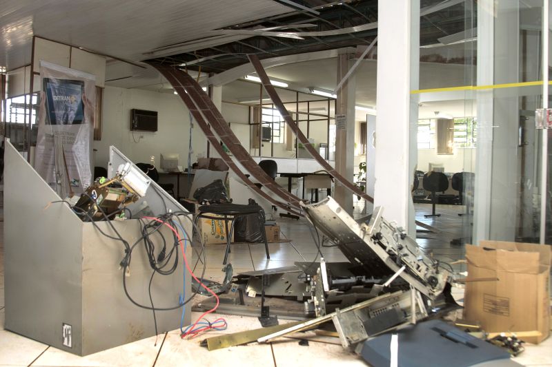 Um caixa eletrônico do Banco do Brasil, localizado dentro do prédio da 7ª Circunscrição Regional de Trânsito (Ciretran), em Cascavel, foi destruído por uma explosão. A detonação aconteceu no início da manhã desta quinta-feira (4) e danificou também as dependências do órgão, que está com o atendimento suspenso até a próxima segunda-feira (8). Conforme informações da Polícia Militar (PM), quatro criminosos, alguns armados renderam os vigilantes por volta das 3 horas e iniciaram a tentativa de arrombamento do caixa eletrônico com uma serra. Como não conseguiram, os ladrões buscaram outro meio para abrir o equipamento.