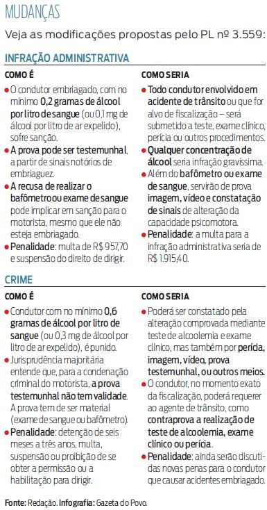 A nova versão vai descrever, dentro do artigo 306 do Código Brasileiro de Trânsito, uma nova possibilidade para a constatação do estado de embriaguez do motorista pela "alteração da capacidade psicomotora decorrente do uso de álcool." "O agente de trânsito não mais dependerá de ato voluntário do condutor para certificar seu estado e caracterizar a infração. Poderá valer-se de outros meios probatórios para tanto, já dispostos em relação à infração penal, despida do entrave técnico", diz o relatório do deputado.