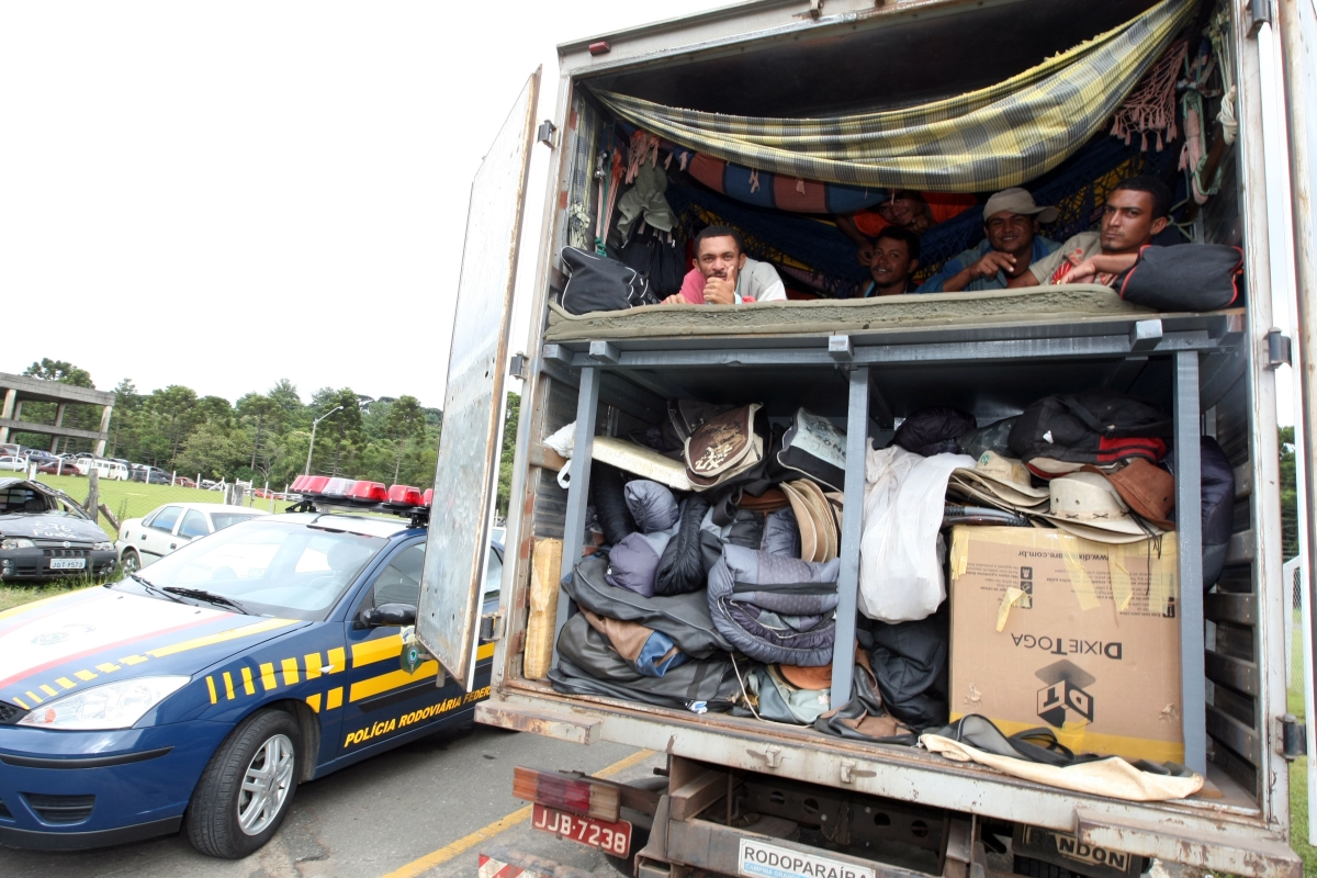 Um caminhão que seguia de Patos (Paraíba) para Chapecó (Santa Catarina) foi apreendido na madrugada desta sexta-feira (23) pela Polícia Rodoviária Federal (PRF) de Curitiba , por transportar, em condições sub-humanas, 34 homens. De acordo com a PRF, eles foram recrutados para trabalhar no comércio de artigos de couro. Diante da situação, Silvan Florentino Coutinho, de 23 anos, motorista do veículo, e Denys Lucena de Araújo, de 24, acusado de ser o agenciador dos trabalhadores, foram detidos e levados à 1ª Delegacia da PRF, no município de Colombo, na região metropolitana de Curitiba, acusados do crime de trabalho escravo.
