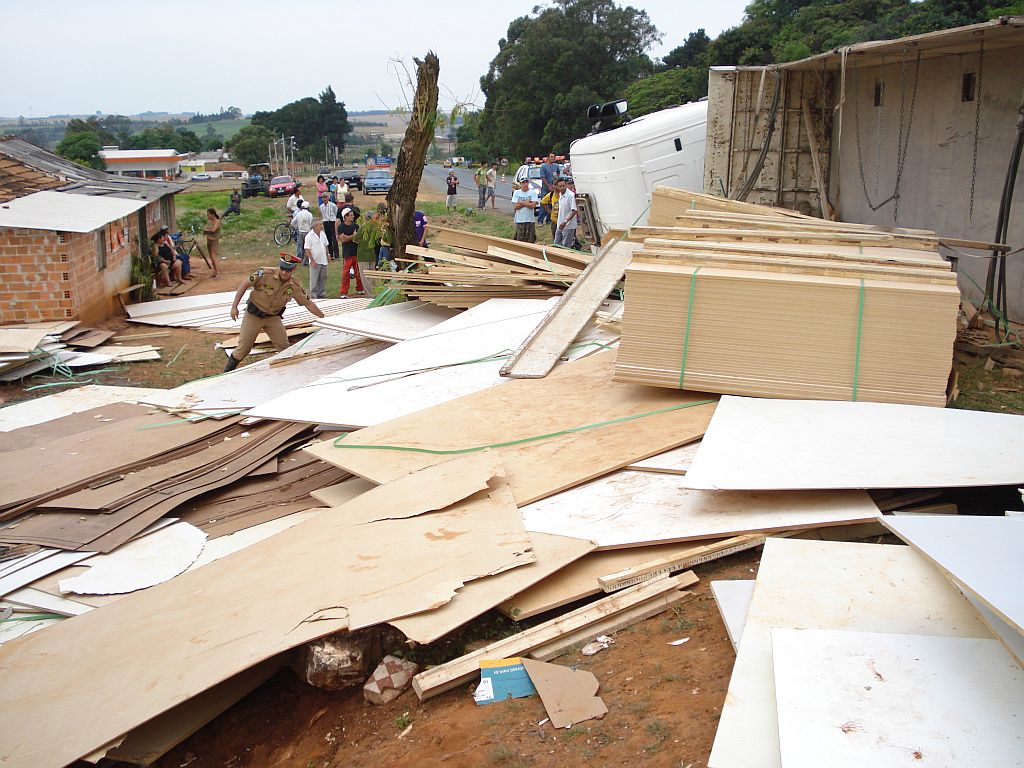 Wenceslau Braz - Uma pessoa morreu e outras duas ficaram feridas ontem, por volta das 17 horas, em acidente no quilômetro 253 da PR-092, no perímetro urbano de Wenceslau Braz, Norte Pioneiro. Um caminhão com placas de Porto Xavier (RS) carregado com lâminas de compensados de madeira se perdeu na curva e tombou. Parte da carga foi lançada para a margem da rodovia, onde há um conjunto de pequenos bares. Uma mulher identificada como Cláudia dos Santos, de 32 anos, que trabalhava em um dos estabelecimentos, foi atingida pela carga e morreu na hora.