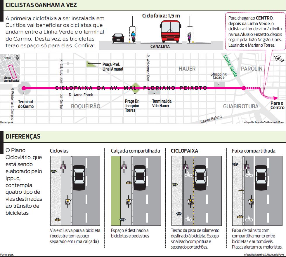 Pela primeira vez Curitiba vai receber uma ciclofaixa, espaço exclusivo para bicicletas, separado por tachões e que fica ao lado da via usada por carros. O projeto será implantado na Avenida Marechal Floriano Peixoto entre o Terminal do Carmo e a Linha Verde (antiga BR-116) e deve ter cerca de seis quilômetros de extensão. A ciclofaixa ficará entre os carros e a canaleta do ônibus expresso, com 1,5 metro de largura, e vai ser instalada nos dois sentidos. "A intenção é de que num lado andem os ciclistas na direção Centro e, no outro, os que vão ao bairro", afirma a gestora de mobilidade urbana Olga Mara Prestes, da Urbanização de Curitiba (Urbs).