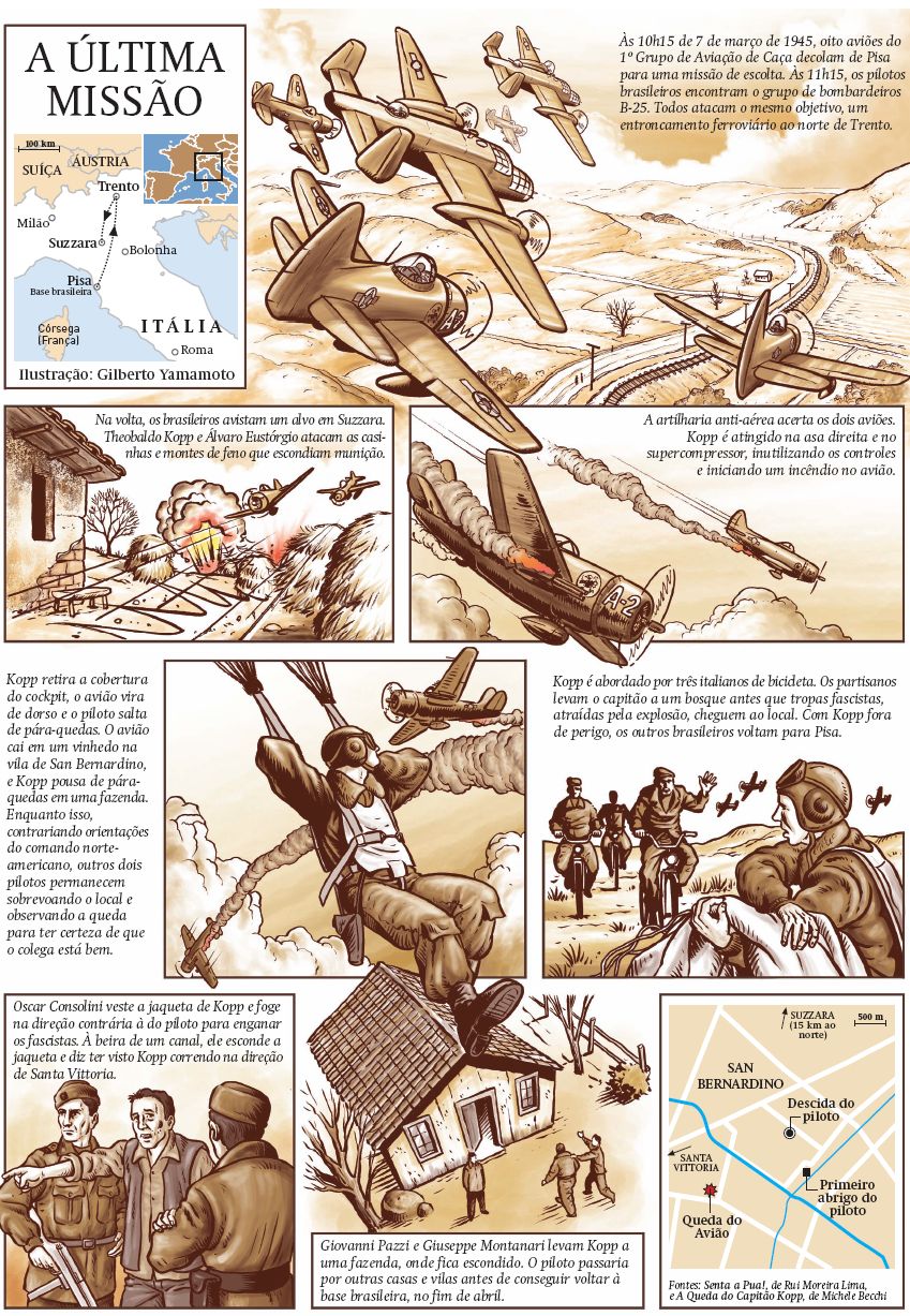 No começo da tarde de 7 de março de 1945, o cabo Eronides da Cruz, municiador de caças P-47, e seus colegas contavam os aviões que retornavam de uma missão no Norte da Itália era um hábito de quem ficava em terra. Deveriam voltar oito, mas apenas sete desceram. Faltava o capitão Theobaldo Kopp, um curitibano que havia decolado como líder da Esquadrilha Vermelha. "Toda vez que isso acontecia, um pedaço da gente ficava do outro lado. Apesar de os oficiais não ficarem hospedados junto com os praças, o grupo era uma família", diz o veterano, referindo-se ao 1º Grupo de Avia-ção de Caça, a unidade dos aviadores brasileiros na Segunda Guerra Mundial.