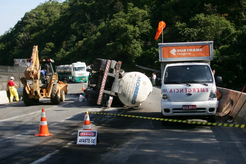 O acidente com um caminhão-tanque que levava 27 toneladas (cerca de 16 mil litros) de ácido fosfórico ontem, por volta das 9h15, na BR-376 sentido Curitiba-Joinville (SC), complicou a vida de milhares de motoristas. O veículo tombou entre o quilômetro 668 e 669, na chamada Curva da Santa, e deixou o trecho interditado durante todo o dia. Por volta das 18 horas, a fila de carros e caminhões era de 26 quilômetros. O acidente também pode ter consequências ambientais: cerca de 2 mil litros da carga vazaram na pista e atingiram o Rio São João, que desemboca em Garuva (SC). Os impactos causados pelo produto tóxico no rio ainda não foram mensurados. Um laudo do Instituto Ambiental do Paraná (IAP) deve sair em 15 dias.
