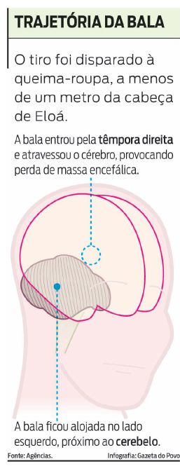 De acordo com Setti, o trajeto da bala foi muito longo e atingiu grande parte do cérebro, alojando-se no cerebelo. A cirurgia foi feita para "corrigir a destruição" e não para retirar o projétil, que continua no mesmo lugar. Não há expectativa de uma nova cirurgia, segundo o médico. A bala foi disparada à queima-roupa, atingiu o lado direito da cabeça da garota e houve perda de massa encefálica. A outra bala que atingiu Eloá, na virilha, foi retirada durante a cirurgia. Nayara Rodrigues Vieira, de 15 anos, amiga de Eloá que também estava no apartamento, foi baleada no rosto.