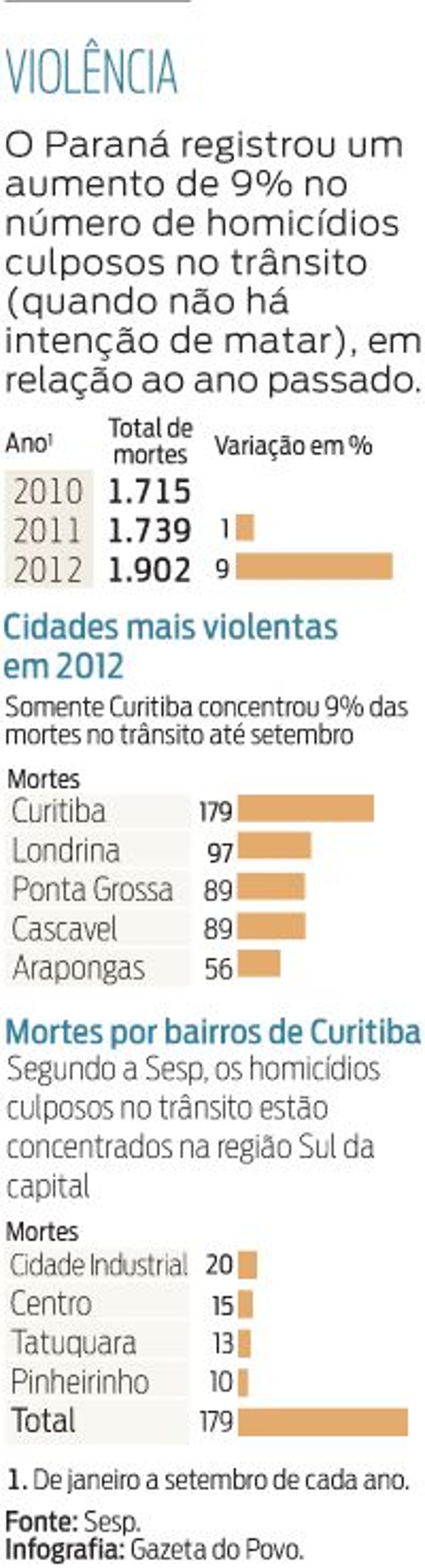Dados da Secretaria de Estado da Segurança Pública do Paraná (Sesp) divulgados esta semana mostram que o número de homicídios culposos no trânsito (quando não há intenção de matar) aumentou 9% em relação ao ano passado, em todo o estado. No total, de janeiro a setembro deste ano foram registradas 1.902 mortes relacionadas a acidentes com veículos - em 2011, foram 1.739 vítimas.