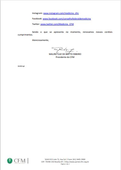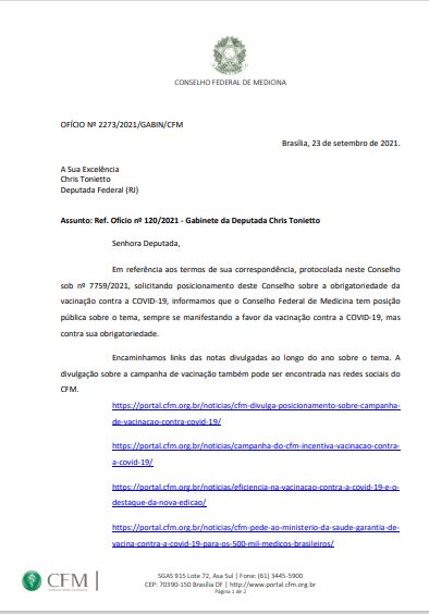 A informação sobre o ofício foi divulgada pela deputada, por meio das redes sociais, nesta sexta-feira (24). “O Deputado Estadual Marcio Gualberto e eu oficiamos o Conselho Federal de Medicina (CFM) para saber do seu posicionamento oficial acerca da obrigatoriedade da vacinação. O CFM disse ser favorável à vacinação, mas contrário à sua obrigatoriedade”, disse a parlamentar. (Veja o ofício abaixo).