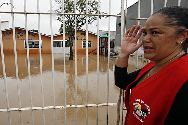 A forte chuva que atingiu bairros da região sul de Curitiba deixou 60 crianças de 2 a 12 anos ilhadas em uma creche no bairro Xaxim, ontem à tarde. Localizada na Rua Dante Honório, a Escola Tia Nenê foi tomada pela água. Ninguém ficou ferido. O resgate foi feito por vizinhos que ajudaram a transferir os alunos para uma casa ao lado até a chegada da Defesa Civil e de funcionários da Fundação de Ação Social (FAS).A diretora da escola, Neira do Carmo, disse que as crianças ficaram muito nervosas quando viram a água subir. Só não foi pior, relata ela, porque a escola tem uma porta de contenção de chuvas, instalada desde 2007. "Sempre sofremos com enchentes, mas nada parecido com o que aconteceu hoje". O galho de uma árvore de grande porte caiu em cima da instalação elétrica. O muro de concreto cedeu e o portão de ferro dobrou, tamanha a força da água. Os moradores da região culpam as obras da Linha Verde pelo assoreamento do Ribeirão dos Padilhas.