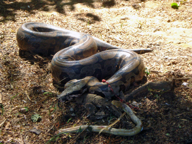 O animal estava na calçada de uma casa e, segundo os bombeiros, estava se alimentando de outra cobra.