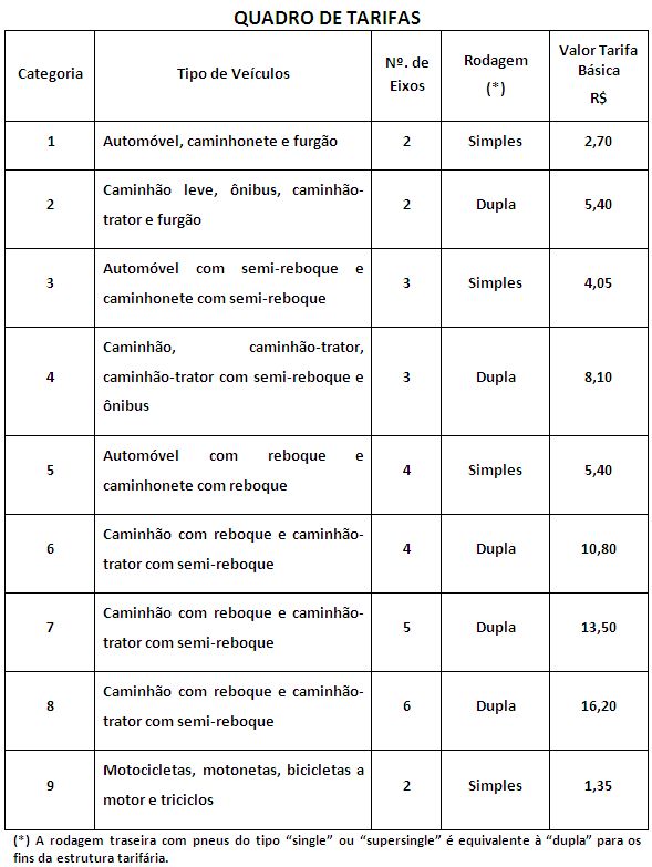 A segunda praça de pedágio da BR-116, no trecho em Curitiba e a divisa dos estados de Santa Catarina e Rio Grande do Sul, começa a funcionar à zero hora do próximo domingo (18). O pedágio está localizado no quilômetro 152 da rodovia, no município catarinense de Santa Cecília. O preço da tarifa será de R$ 2,70 para carros de passeio. O valor para os demais veículos pode ser conferido na tabela abaixo.