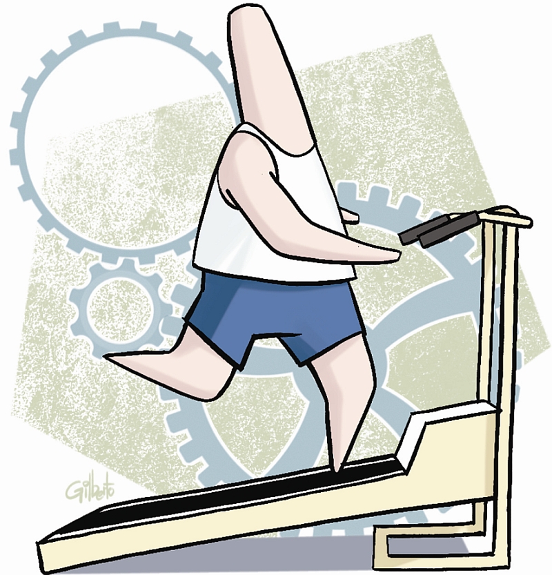 Foi esse maldito primeiro passo que me derrotou. Sempre há antes uma crônica para escrever, um livro para terminar, um e-mail para responder, um jornal para ler, uma lâmpada para trocar, uma compra para fazer. Ardiloso sou duro na queda pesquisei os sites de internet atrás de uma máquina de caminhar. Nem para isso eu saí daqui do computador, para vocês sentirem o grau da minha decadência. Em pouco tempo chegou o trambolho digo, a esteira aqui em casa. O painel é bonito: diz quantos quilômetros já "andei", quantas calorias queimei, em que altura está o batimento cardíaco, quantos quilômetros por hora estou fazendo, além de outros recursos secretos que vou desvendando no manual. O problema é: você fica 45 minutos no mesmo lugar.