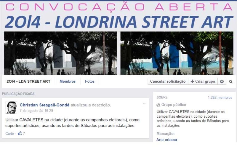Um grupo de Londrina está convocando pessoas pelo Facebook para que exponham a insatisfação com os políticos por meio da pintura de cavaletes de propaganda colocados nas ruas (foto). A página foi criada no dia 7 de agosto por um usuário identificado como Christian Steagall-Condé, professor da Universidade Norte do Paraná (Unopar). A proposta é usar as tardes de sábado, durante toda a campanha eleitoral, para transformar os cavaletes com diferentes técnicas artísticas o que seria uma forma de "reciclar lixo tóxico", segundo a descrição na rede social. A iniciativa pode ser conferida na página "2014 - LDA Street Art". Até ontem no fim da tarde, o grupo contava com 1.260 membros.