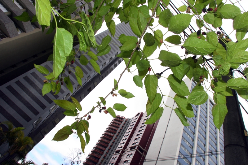 É uma beleza de se ver. Em plena Avenida Visconde de Guarapuava, na altura do cruzamento com a Rua Alferes Angelo Sampaio, uma amoreira cresceu no canteiro central. Nesses dias, ela está carregada de frutinhas, que, mal amadurecem, são devoradas por passarinhos e transeuntes. Aliás, aquele canteiro largo da Visconde de Guarapuava merecia ganhar mais árvores de pequeno porte, que tornem menos árida a avenida de tráfego intenso. * * * * *